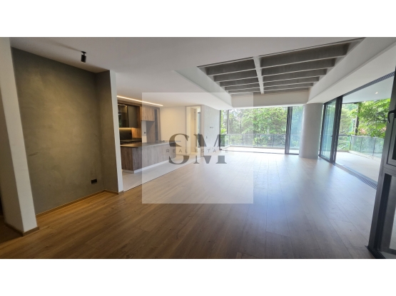 Apartamento de 240 m² distribuidos en dos habitaciones, principal con baño privado, doble ducha, doble lavamanos, vestier y ventanal piso a techo, auxiliar con baño privado, closet, y vidriera con acceso a balcón, espacio para estudio o sala de TV con ventanales piso a techo, cocina abierta con isla, equipada con electrodomésticos suizos de alta gama (marca Franke), doble cubierta de gas e inducción, lavavajillas panelable Smeg y herrajes cierre lento Blum. Los mesones de cocina y baños son en piedra sinterizada (Altea), con acabados en microcemento importado y ventanería europea insonorizada y térmica, conecta con area social generoso y balcón tipo terraza en “L” que rodea toda el área social con vista externa verde, zona de ropas independiente con baño de servicios, tres parqueaderos y un cuarto útil.
